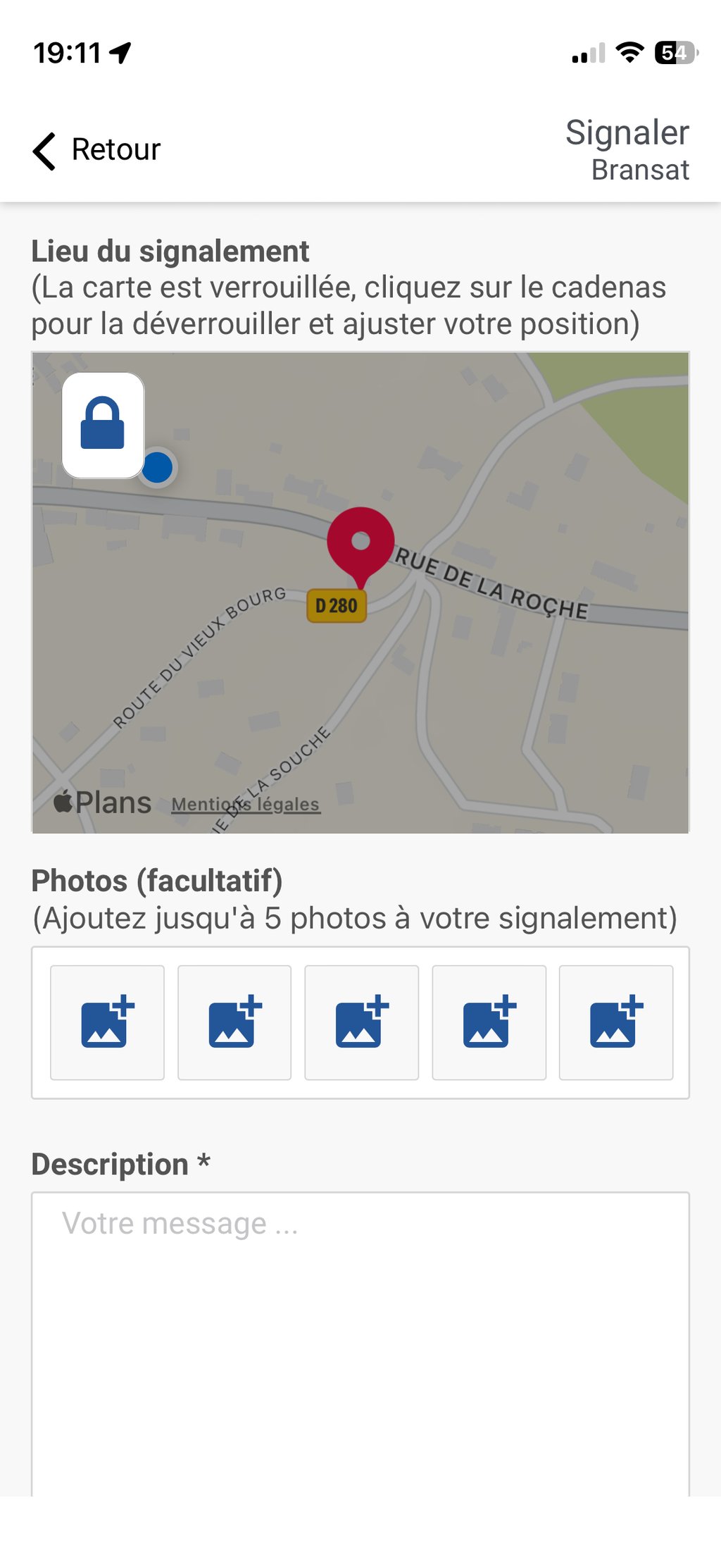 En cliquant dessus, vous accédez à un formulaire permettant de positionner sur la carte, de joindre une ou des photos et d'expliquer ce qui se passe .