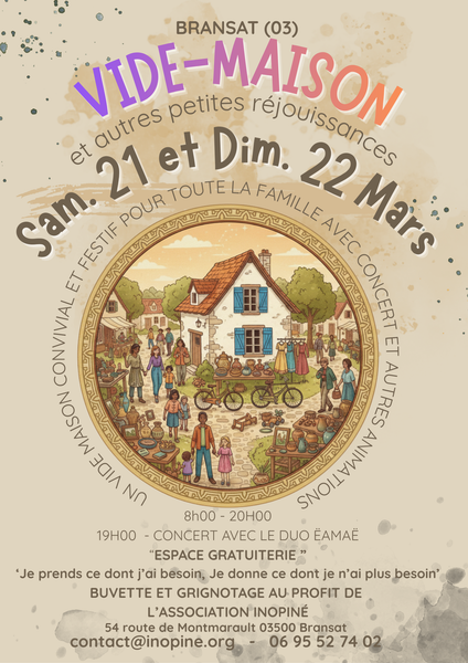 Prêt pour le vide-maison le plus festif de Bransat ? Venez chiner, danser au concert d'Ëamaë et profiter de la "gratruiterie". Buvette & snacks au profit de l'asso Inopiné. Convivialité garantie de 8h à 20h ! On vous attend !